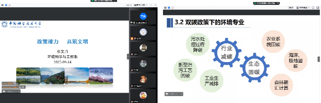 在专题党课上,张文真对2022级研究生新同学致以热烈欢迎,并以《政策接力,共筑文明》为题,从“中国共产党的政策‘接力赛’、碳达峰碳中和政策解读、环境专业与生态文明”三个方面展开作生态文明专题党课报告。首先,张文真带领大家回顾了国家在新能源、光伏产业等方面的政策演变,让同学们深刻领悟中国过去几十年的发展成就与政策之间的密切联系。随后,张文真介绍了我国碳达峰碳中和政策的实施背景,分析了现阶段碳达峰碳中和面临的形势,指出未来应从调整能源结构等方面继续努力,早日实现碳达峰碳中和的目标;最后,张文真强调,双碳政策下的环境专业与生态文明建设息息相关,勉励青年学子须担当有为,把个人理想追求融入到党和国家的事业中去,潜心学习、执着创新,投身生态文明建设,为守护碧水蓝天贡献自己的力量。