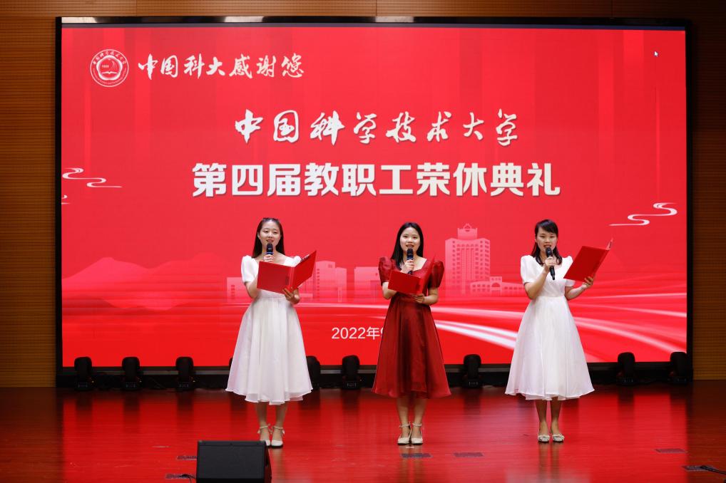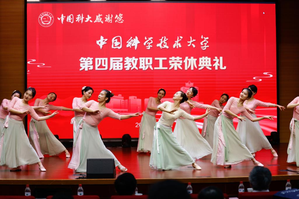 水上报告厅的屏幕上,醒目地写着“中国科大感谢您”,向荣休教职工表示感谢、传达敬意。荣休典礼在基础教育集团附属中学老师带来的诗朗诵《九月赞歌》和教职工舞蹈协会老师带来的舞蹈《茉莉花》中开始。