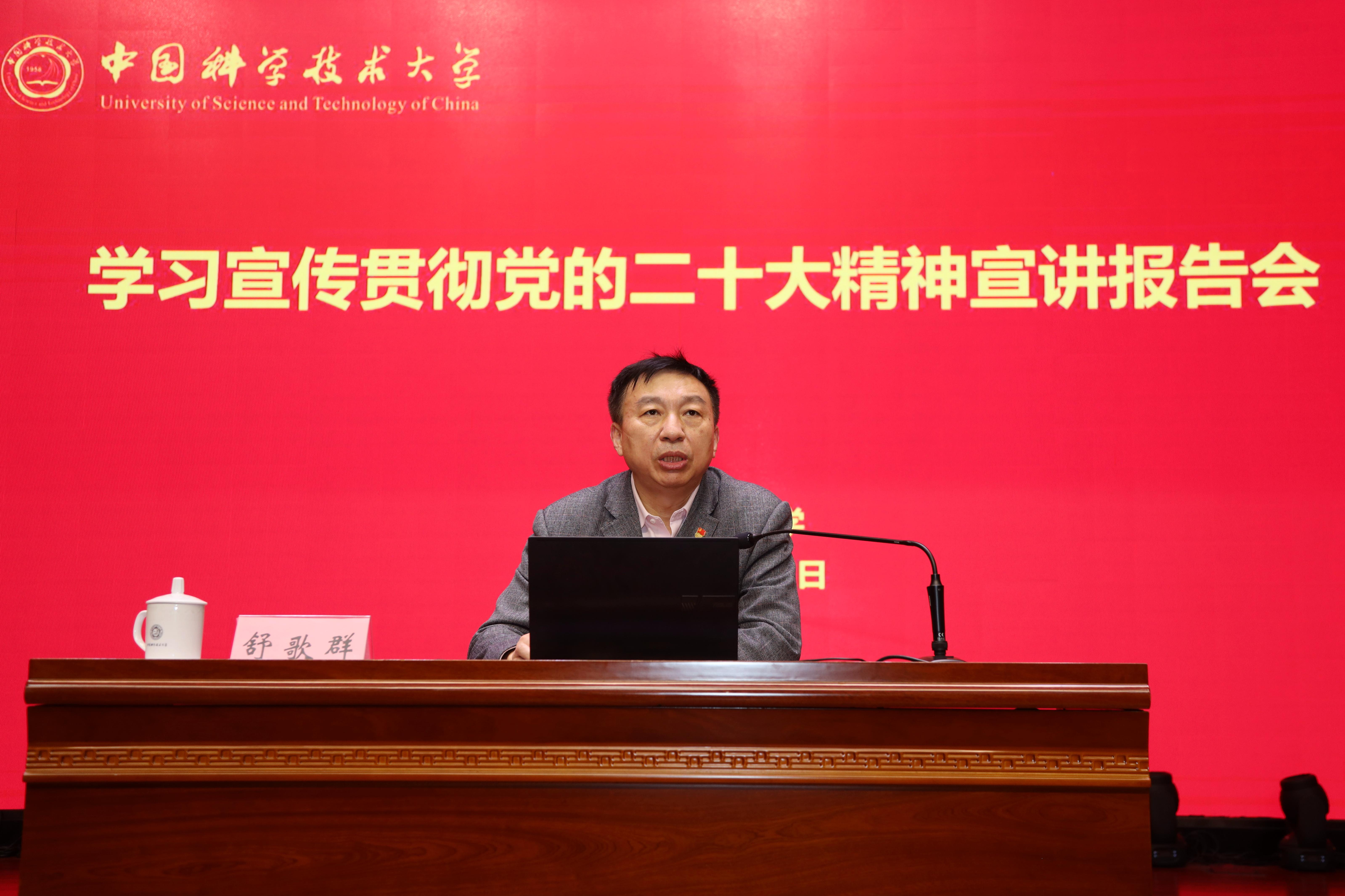 舒歌群指出,党的二十大是在全党全国各族人民迈上全面建设社会主义现代化国家新征程、向第二个百年奋斗目标进军的关键时刻召开的一次至关重要的大会,是一次高举旗帜、凝聚力量、团结奋进的大会。他强调,党的二十大精神内涵丰富,具有重要理论引领力和强大实践指导力,为全面擘画未来、描绘中华民族伟大复兴光辉前景提供航标。他强调,学校各有关单位要将学习宣传贯彻党的二十大精神作为当前和今后一段时期的首要政治任务,要结合学校教育和科技创新工作,聚科教人才合力,铸国家强盛之基,切实把学习成果转化为推动学校事业高质量发展的工作动力,潜心立德树人、执着攻关创新,为深入实施科教兴国战略、人才强国战略、创新驱动发展战略贡献科大力量。