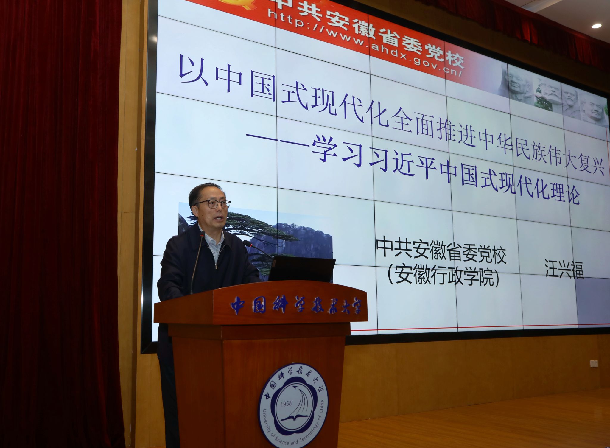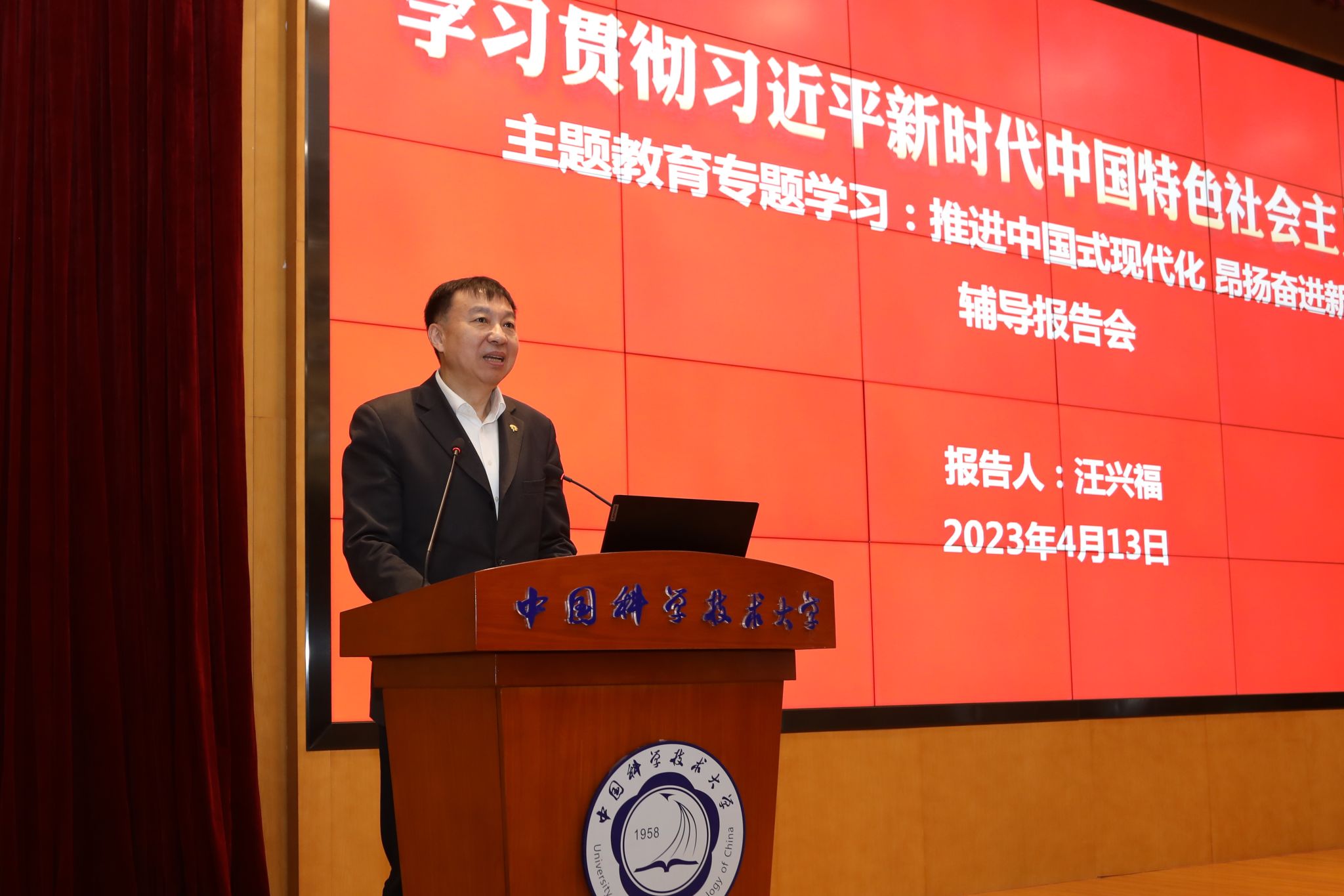 为深入开展学习贯彻习近平新时代中国特色社会主义思想主题教育,4月13日上午,中国科学技术大学在东校区物质科研楼三楼报告厅,围绕“推进中国式现代化,昂扬奋进新时代”举行专题辅导报告会。中共安徽省委党校(安徽行政学院)马克思主义学院院长、教授、博士生导师汪兴福受邀作题为《以中国式现代化全面推进中华民族伟大复兴》的报告。报告会由校党委书记舒歌群主持。