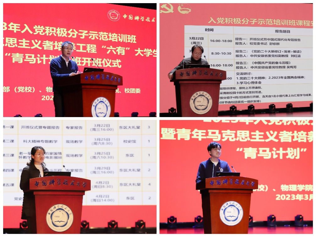 入党积极分子示范培训班、“六有”大学生“青马计划”班是我校加强大学生思想政治教育工作的重要举措,党委组织部(党校)、物理学院、马克思主义学院、校团委通力协作、共享课程。培训班将通过系列理论课程和实践锻炼,全面学习宣传贯彻党的二十大精神,围绕学校“潜心立德树人,执着攻关创新”两大核心任务,秉承“红专并进、理实交融”的校训,着力为党和国家培养输送中国特色社会主义事业的合格建设者与可靠接班人。