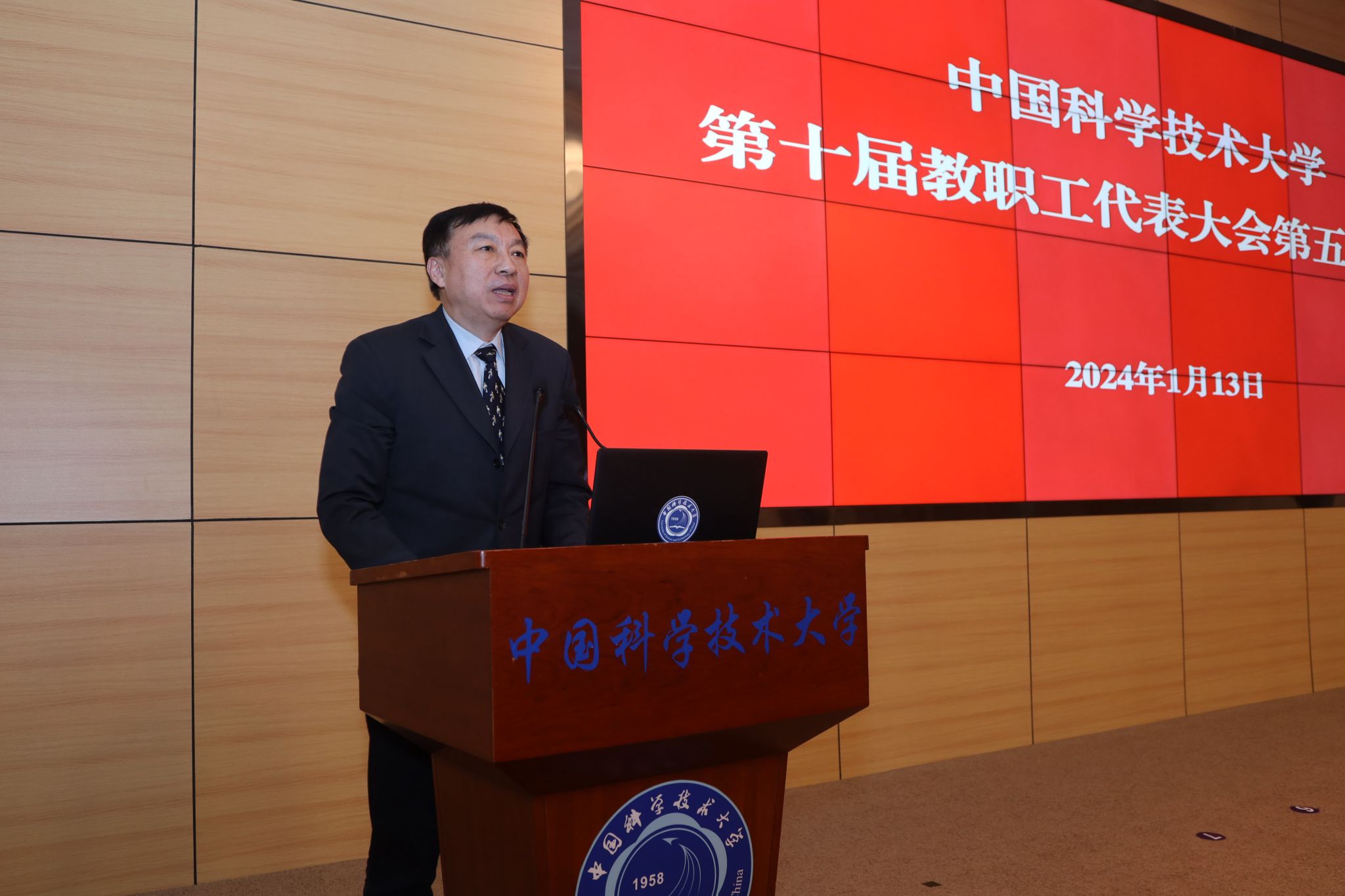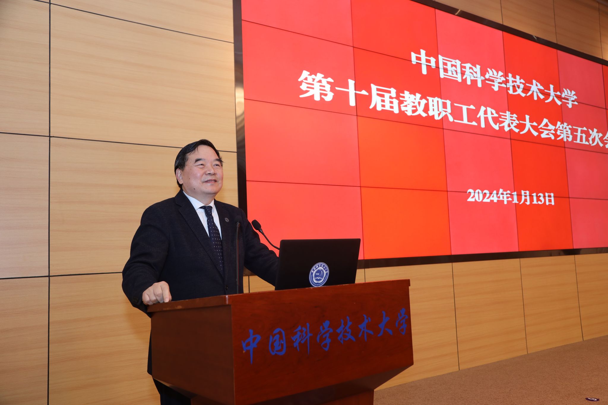 按照会议议程,周丛照宣读《中国科学技术大学第十届教职工代表大会第五次会议纪要》。会议号召,全校师生员工在校党委领导下,以习近平新时代中国特色社会主义思想为指导,深入贯彻落实党的二十大精神和即将召开的中国科大第十三次党代会精神,深入推进“教育、科技、人才”一体部署,潜心立德树人,执着攻关创新,努力办出中国特色、科大风格的世界一流大学,为抢占科技制高点,为加快教育强国、科技强国、人才强国建设贡献科大力量。