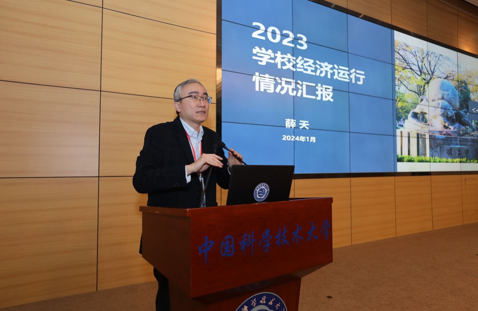 包信和作题为《策马扬帆争创佳绩 启程奔浪勇开新局——奋力建设中国特色、科大风格的世界一流大学》的行政工作报告。他指出,在中国科学院、教育部和安徽省委省政府的坚强领导下,学校领导班子坚持以习近平新时代中国特色社会主义思想为指导,深入学习宣传贯彻党的二十大精神,将习近平总书记关于中国科大系列重要指示精神贯穿办学治校各环节,团结带领全校广大师生员工,潜心立德树人,执着攻关创新,在基础性、战略性工作上狠下功夫,奋力建设中国特色、科大风格的世界一流大学,不断推进学校事业发展取得新进展。