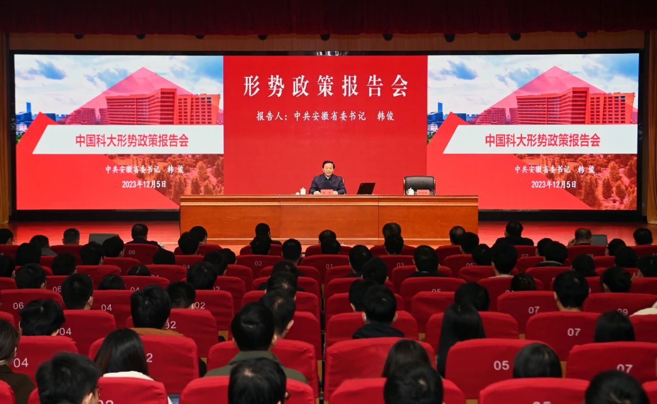 12月5日上午,省委书记韩俊专程赴中国科学技术大学作形势政策报告。他强调,要深入学习贯彻习近平总书记重要讲话重要指示精神,潜心立德树人,勇攀科技高峰,争做中国式现代化的先锋力量,书写新时代省校合作崭新篇章。省委常委、秘书长、政法委书记张韵声,副省长任清华,中国科大校长包信和出席。中国科大党委书记舒歌群主持报告会。中国科大500余名师生代表参加报告会。