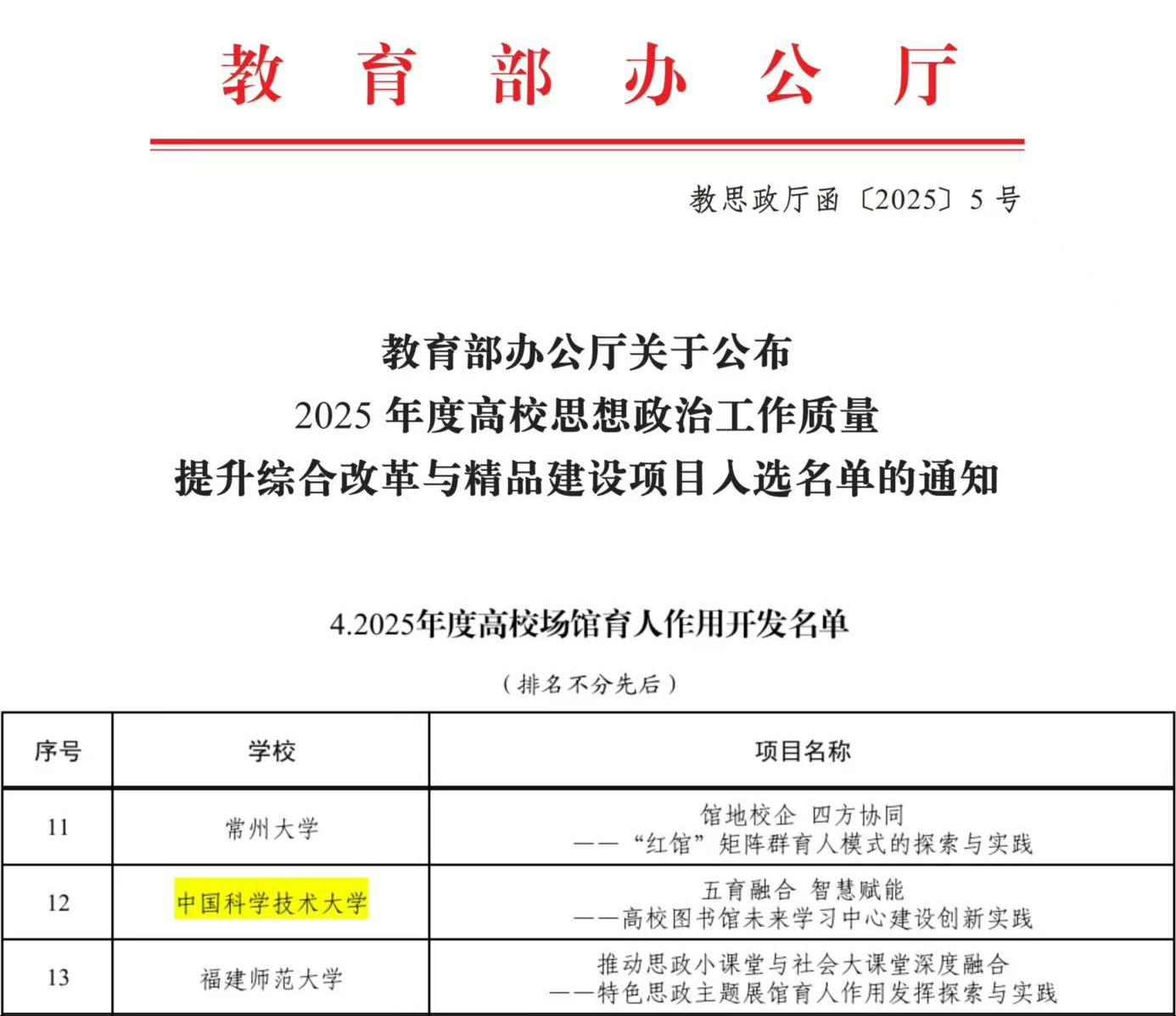 中国科大一项目入选教育部高校思想政治工作质量提升综合改革与精品建设项目名单