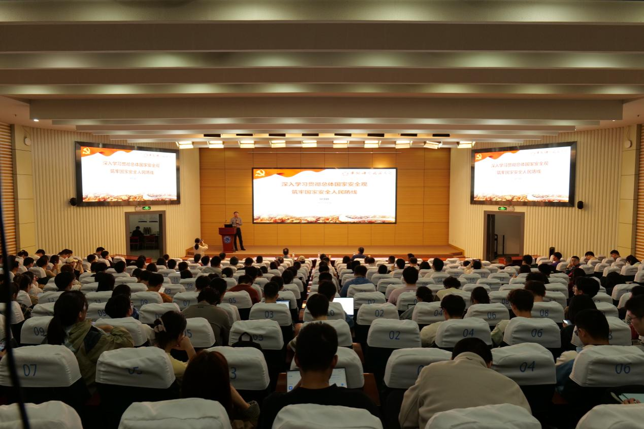 4月15日,校党委书记舒歌群面向400余名师生代表作《深入学习贯彻总体国家安全观 筑牢国家安全人民防线》主题报告。舒歌群结合国际国内安全形势,系统解读了总体国家安全观的主要内容和丰富内涵,深刻剖析政治安全、经济安全、科技安全等领域的风险挑战,并结合校园安全工作实际,为师生上了一堂兼具理论深度与实践指导意义的国家安全教育课。