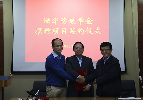 “增华奖教学金”是由我校60级6系陈增圭校友及夫人王爱华女士捐赠。取名“增华”寓意为中华增光、为中华增辉。陈增圭校友及夫人共捐赠两百万元,每年理财收益的十二万元用于该奖教学金。陈增圭、刘志峰、陈卫东一同签署了捐赠协议。随后,陈卫东详细介绍了信息学院的发展情况,感谢陈先生对学院建设发展的支持。