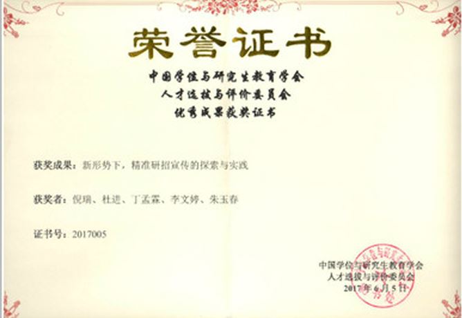 我校研究生招生宣传工作在研究生教育领域产生了广泛影响,2017年6月,我校申报的“精准研招宣传工作的探索与实践”获中国学位与研究生教育学会人才选拔与评价委员会“优秀成果奖”,同时受邀在“全国研究生招生工作学术研讨及培训会”上做报告,向兄弟高校介绍我校的研招经验。