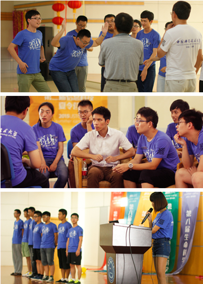 计算机科学与技术学院的钱海书记简短的发言之后便开始了冷餐会的第一个环节:营员分组PPT展示,六组营员依次介绍了自己的组名、口号和基本信息,并竞相在最后时刻摆出本组特有的pose,个性十足,青春尽显。第二个环节的游戏更令大家忍俊不禁。老师连同营员们共同参与,一个比划着动作,另一个绞尽脑汁地猜词汇,其中遇到“人工呼吸”这个词汇时,两个男生以迅雷不及掩耳之势一个迅速躺在地另上一个蹲下身去欲吻嘴,一时间爆笑全场,老师也是相当给力的给出了正确答案。老师与营员恰若熟识已久的朋友,那么自然亲切。经过前两个环节的铺垫,营员们在第三环节的师生交流中纷纷放下羞怯,和老师们围坐一团,畅聊学术。四川大学的盘博文笑着说道:“科大的老师和志愿者都把我们当做VIP级别的宾客来接待,我们玩得特别开心,真是一次难忘的经历。”
