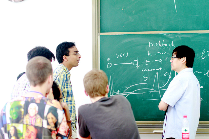7月4日开营仪式后,每天上午都有三场为营员们精心准备的学术讲座,涉及量子信息、天文学、核聚变、生物物理等多领域的前沿问题。营员们无论是在讲座过程中还是在提问环节,都积极主动,表现出对物理十足的热情。在易为教授做完关于超冷原子的介绍后,意犹未尽的营员们围住老师进行了深入而激烈的讨论,直到下一场讲座开始才依依不舍地散去。