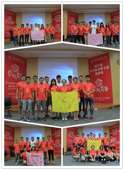 活动伊始,志愿者们将微信留言墙巧妙地运用其中,立马将同学们的热情调动起来。紧接着,各项精彩活动轮番上演。志愿者带队展开的“部门建设”游戏,将大家的心紧紧凝聚在一起。营员与志愿者深情对唱环节,更是引爆现场观众的热情。一场“摘帽子”游戏将晚会气氛推向了高潮,女营员们尽显自己的飒爽英姿,在不分伯仲间大家握手言和。最后,快门闪烁,一张集体大合照将所有人的笑脸定格下来,欢声笑语中光子科学夏令营结束了难忘的第一天。