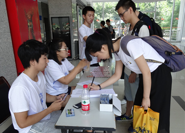 早上7:30,夏令营的志愿者们就已在接待大厅就位,准备迎接参加夏令营的同学们。8点开始一直到下午4:30,陆续有营员前来报道。在志愿者们的引导下,营员们认真核对好个人信息,签名确认之后,志愿者给营员发放营服、胸牌、书包等,并耐心讲解在校注意事项以及下午参观校史馆和晚上全营见面大会等安排。
