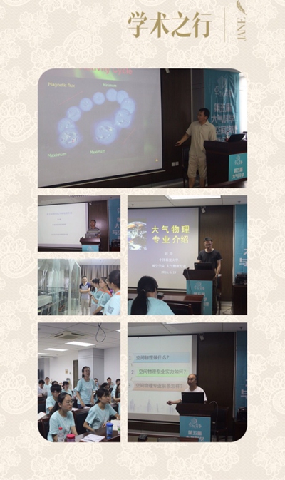 地球物理系姚华健教授、大气物理系刘奇教授、空间物理系陆全明教授轮番上阵,对地空学院学科建设、人才培养、师资力量、资源优势等方面作了详细介绍。紧接着,空间物理系的刘睿教授讲解了太阳风暴与空间灾害相关研究,他从神秘的极光、彩色的星球、延绵不断的太阳风入手,一直讲到太阳活动循环下存在的明清小冰期、崇祯大旱等极端天气现象;还以信鸽为例,阐释了地磁扰动产生的磁暴如何影响导航通讯,引得全场连连喝彩。随后,孙亮教授、陶鑫教授分别对海洋探测技术和空间等离子体物理作了系统介绍。营员们也分别就台风对我国的影响、旋涡对气候变化的效应等进行了现场提问。