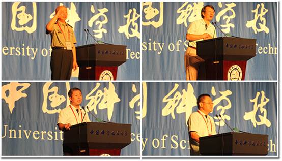 周从直(607)、张岩(802)、熊辉(9010)、潘发强(05MBA)等校友随后代表各年级校友上台发言,回顾了自己人生中最黄金的大学时光,科大对自己人生成长的影响,表达了对母校的培养的感谢。张岩校友说,“在母校学会了游泳、学会了乐器,还学会了给女同学送花”。他们同时也表达了对母校未来发展的期望,祝愿中国科大早日成为世界一流的研究型大学,成为中国人才的最高地。
