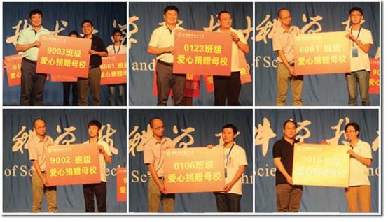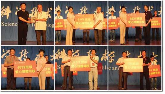 会上,校党委书记许武,校友总会副会长鹿明、郭胜利,校友总会副秘书长胡韶山、刘志峰,校友总会办公室主任朱洪超等代表学校接受了605、6531、6532、802、8061、808、9002、9003、9010、0123、0106的集体捐赠,并对校友们支持母校、关心母校发展表示衷心感谢。