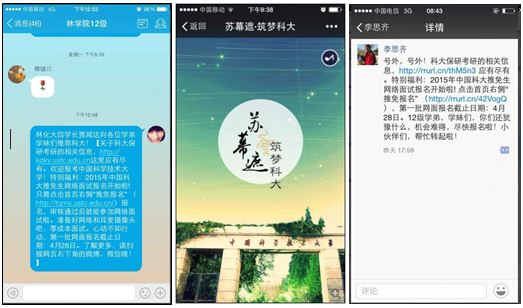 为了能够在“互联网+”的形势下更好地开展研招宣传,我校充分利用现有资源,积极开拓渠道,从2月开始,研招办即通过发送元宵节祝福短信等举措给予2015级保送到我校读研的非皖高校的本科生以人文关怀,从而有力地发动了他们的力量,鼓励他们以“准科大人”的身份在本科母校里积极宣传科大,包括推免生网络面试和优秀大学生夏令营等。他们积极在校内论坛、贴吧、QQ空间、微信朋友圈等不同媒体渠道开展线上宣传,同时在校内以考研经验交流、张贴夏令营海报等活动开展实体宣传。这不仅提升了同学们对科大的认同感,而且为我校的研招宣传事业做出了贡献。