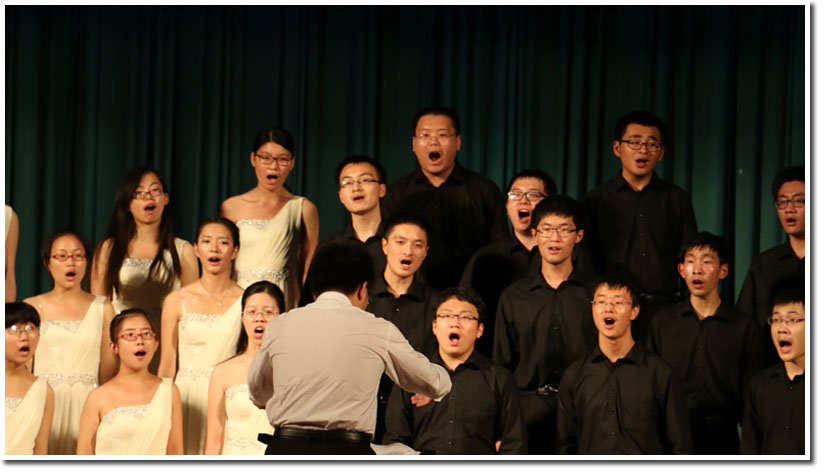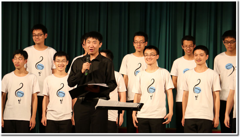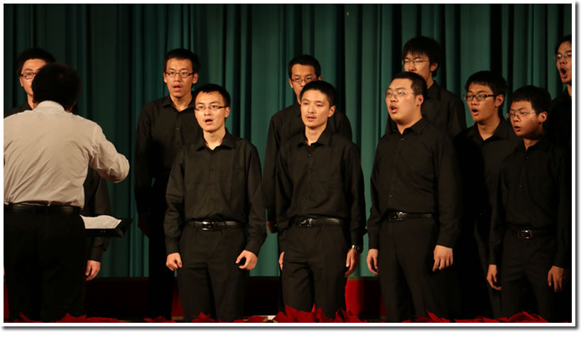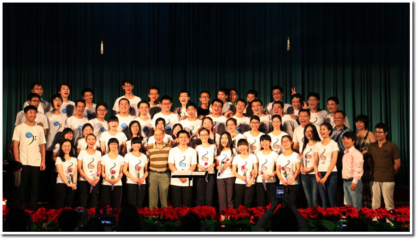在现场观众热情相邀下,合唱团多次返场,分别演唱了《花树下》,《夜来香》,《月琴》,Good Night Sweet Heart It’s Time To Go。校歌《永恒的东风》响起在礼堂中,歌声雄壮,东风如昔,其中承载起多少记忆!58年的老校友来到台上,执手谈笑,风烛巍巍,述说自己在这个舞台上首次唱起校歌的故事。老人直言,学生合唱团团员们的音色尚不统一,合唱此途依旧艰深。