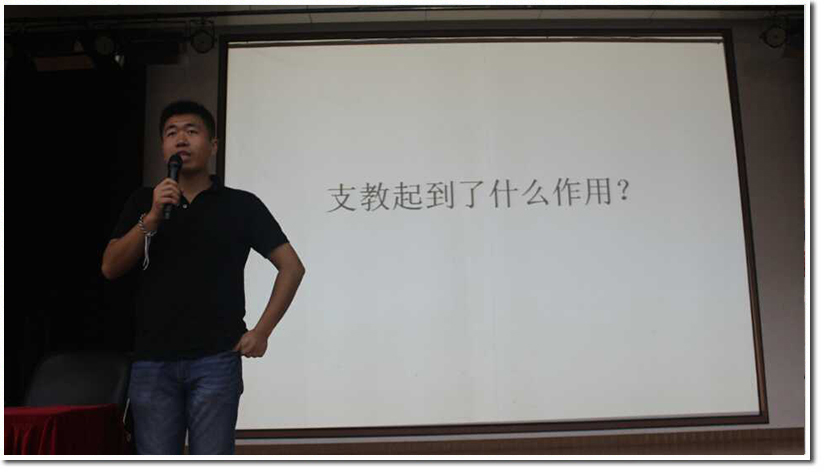 支教报告会分别在西区礼堂及东区大礼堂举行。在播放完支教纪录片《西海固的种子》后,校研究生支教团第十四届支教队队长郑伟、第十五届支教队队长刘慧、第十五届支教队队员刘翼和尹雄拼依次登台,为西区新生介绍了我校支教事业的背景、校研究生支教团的成长历程、运作模式、品牌活动及所获荣誉,并从不同的角度分享了他们一年支教的收获与个人感悟。