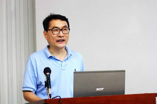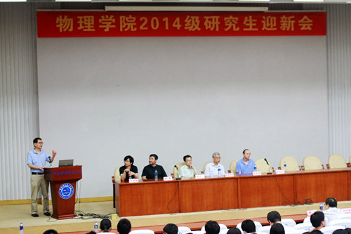 院分党委书记兼副院长叶邦角教授首先代表全体老师欢迎来自全国高校的优秀大学生以及中科院代培研究生加入物理学院。他说,“相信在未来二三十年,同学们当中一定会涌现出一大批国际国内的物理学大师”。随后,他从物理学院组成、雄厚的师资力量、广谱的科学研究体系、活跃的创新团队、杰出的物理人才培养、特色鲜明的英才培养体系、一流的科研成果、亮丽的科学研究论文、广泛的国际交流以及良好的国际学术声誉等几方面介绍了物理学院的概况,详细讲解了物理学院研究生培养体系。叶邦角指出,希望同学们能在学习与科研生活之外,多参加学术论坛和社团活动,培养与锻炼自身综合能力及素质。最后,他向新生们提了三点要求:1. 培养合作精神,倡导创新能力;2. 培养严谨的科学态度,规范科研道德;3. 合理安排学习时间,勇于挑战难题。