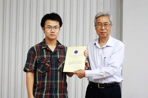 欧阳钟灿院士为今年“吴杭生教授纪念奖”的获奖者2014级研究生丁哲同学颁发了证书。