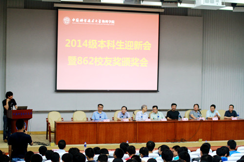 9月5日晚,物理学院在理化大楼东三报告厅举行了2014级本科生迎新大会,会议由分党委书记兼副院长叶邦角主持。中国科学院理论物理所欧阳钟灿院士、物理学院郭光灿院士、物理学院执行院长杜江峰、副院长王冠中、张杨,物理系执行主任林子敬、近代物理系主任陈向军、天文学系执行主任袁业飞、物理实验教学中心主任孙腊珍、光学与光学工程系党总支副书记张永生,2014级辅导员、班主任及全体本科新生参加了大会。