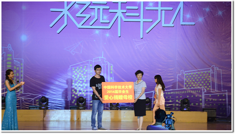 随后,校友总会副会长鹿明代表学校接受2014届毕业生爱心捐赠母校的捐赠牌。主持人随后宣布,为毕业生准备的《致未来的一封信》活动正式启动,毕业生代表陆续上台,将寄给未来自己的信投入信箱,等待十年后返校再次开启。远在异国他乡的科大校友,也用《全球科大人》这一视频形式,为2014届毕业生送来祝福。