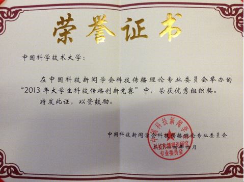 5月22日,由全国科技传播研究会(中国科技新闻学会科技传播理论专业委员会)主办、华中科技大学新闻与信息传播学院承办的“2013年大学生科技传播创新竞赛”日前落幕,我校科技传播与科技政策系5名参赛者脱颖而出,程曦、姚雨婷、郜曼、钱思童4位同学获得一等奖,刘辉获得二等奖。同时,为表彰我校对本次大赛的广泛宣传和大力推广,中国科学技术大学获得了大赛组委会颁发的“优秀组织奖”。