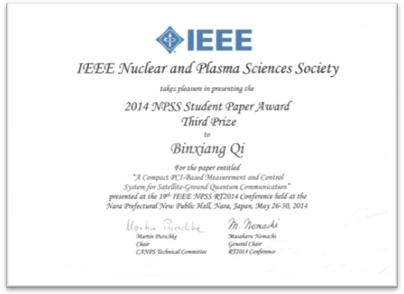 日前,在日本奈良举行的第19届IEEE Real-time学术会议上,来自近代物理系物理电子学2012级博士生祁宾祥提交的论文《A Compact PCI-based Measurement and Control System for Satellite-Ground Quantum Communication》经会议专家组评审,被评为4篇获奖学生论文(Student Paper Award)中的第三名,也是唯一来自中国的获奖者。该论文的通讯作者为物理电子学刘树彬教授。核探测与核电子学国家重点实验室、物理学院近代物理系和量子信息与量子科技前沿协同创新中心为该论文完成单位。