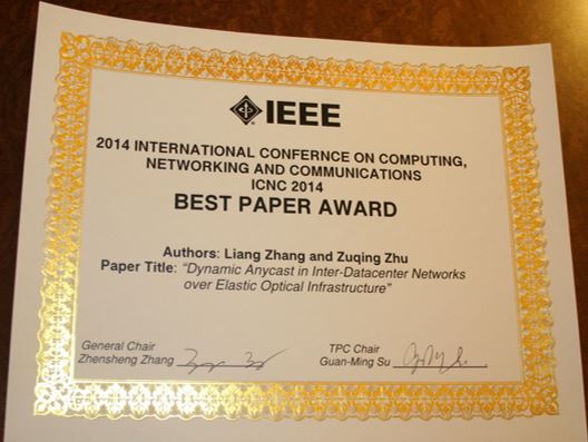 2月5日,在美国檀香山召开的IEEE国际计算、网络与通信大会(IEEE ICNC 2014)上,来自信息学院副教授朱祖勍团队的一篇题为《基于弹性光网络体系的跨数据中心网络中动态任播技术研究》(Dynamic Anycast in Inter-Datacenter Networks over Elastic Optical Infrastructure)的论文获得了大会颁发的最佳论文奖(Best Paper Award)。该论文的第一作者是信息学院电子工程与信息科学系2011级硕士研究生章亮,他的导师、信息学院副教授朱祖勍博士为通讯作者,科大信息学院是文章的第一单位并且是唯一单位。