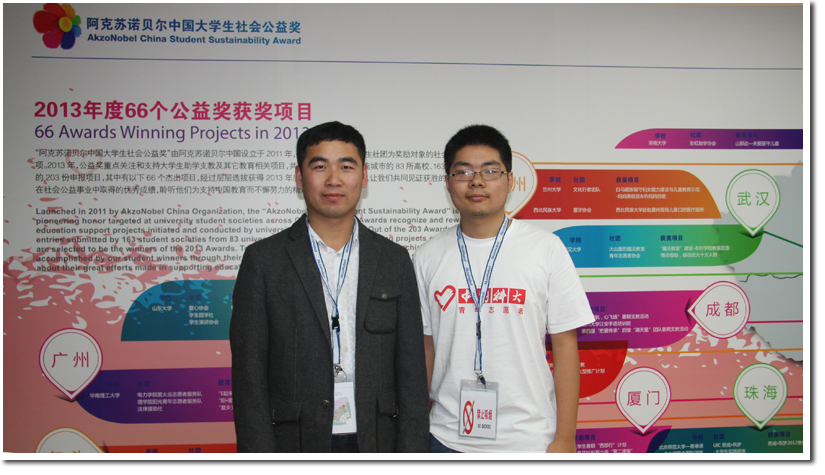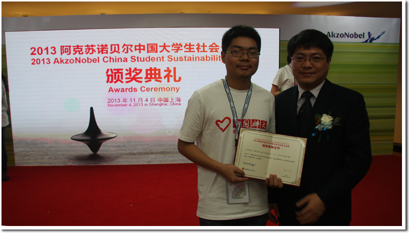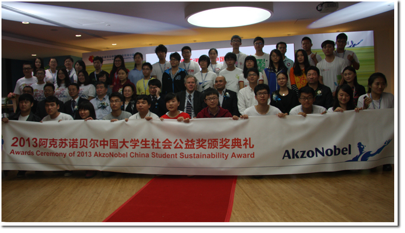 11月4日,“2013阿克苏诺贝尔中国大学生社会公益奖”在上海举行颁奖典礼,中国科学技术大学、清华大学、北京大学等20余所高校相关负责老师与学生出席。