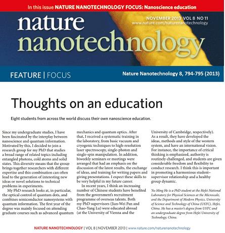 2013年11月出版的《自然》杂志子刊《自然·纳米技术》中,我校量子信息与量子科技前沿协同创新中心和微尺度物质科学国家实验室博士生何玉明与其它来自世界各地包括英国牛津大学、剑桥大学、美国康奈尔大学、西北大学等学校的7位同学一起,受邀对各自在纳米科学方面所受的研究生教育发表了评论。何玉明是亚洲地区唯一被邀请的学生。