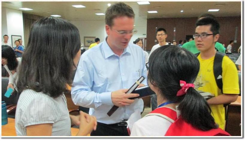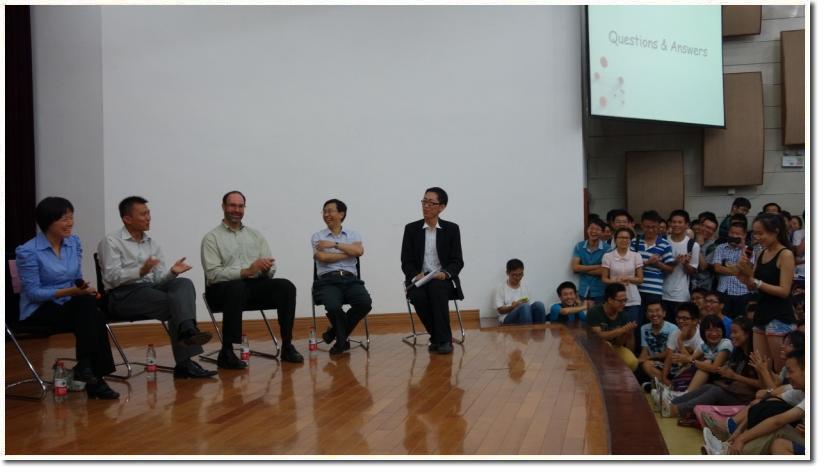 在现场自由阶段,同学们就学术前沿、文化差异、社会时事、团队合作、个人发展等各个方面的问题踊跃提问,教授们坦诚幽默地逐一耐心解答,现场气氛轻松愉快,掌声不断。值得一提的是,两个专场里都只有一位女性“大牛”,她们自然成为了大家发问的焦点。在地球科学专场,Bosak教授愉快地向大家解释女性在自然科学领域同样能做出成果,并且以自身经历安慰大家不用担心女博士嫁人难。在物理化学专场,一位女生直接向崔便晓教授提问“做科研的女性什么时候结婚比较好”,崔教授做出了“我们是科学家,同时也是人”的睿智回答,指出科研需要高度集中注意力,不过安排得当的话还是可以科研家庭两不误的,赢得了现场同学热烈的掌声。