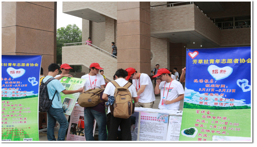 学生社团招新现场盛况非凡,各个社团派出得力干将,尽显自己社团的优势和吸引力,以纳入更多的新成员。校芳草社的志愿者们统一着志愿者服装,耐心细致地为感兴趣的同学讲解校芳草社的情况;吉他社的同学们摆开吉他、乐鼓等器材举办小型现场音乐会;科考协会的同学们搬来了外出考察的全部装备;主持人俱乐部的同学身穿卡通小熊的衣服招惹大家驻足观看。其他社团也不甘示弱,纷纷拿出“十八般武艺”,为校园创建了一道靓丽的风景。