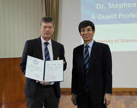 聘任仪式于9月25日上午在国家同步辐射实验室举行,陈初升副校长出席聘任仪式,为两位专家颁发了客座教授聘书,并向两位专家表示感谢,希望两位专家未来发挥特长,帮助我校燃烧学科取得更大的进步。