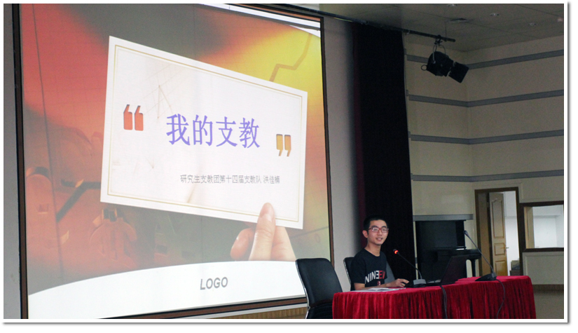 上午,支教报告会在西区礼堂举行。在播放完支教团宣传片后,校研究生支教团团长吴茂乾、第十二届支教队队长周光明、第十四届支教队队长郑伟、队员洪佳楠依次登台,为西区新生介绍了我校支教事业的背景、校研究生支教团的成长历程、运作模式、品牌活动及所获荣誉,并分享了他们一年支教的收获与个人感悟。