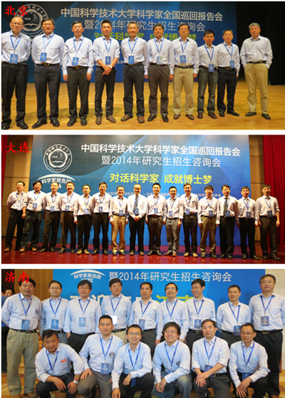 5月13—19日,我校科学家报告会暨2014年研招宣讲咨询活动走进北京、济南、大连、长沙。来自数学学院、物理学院、化学学院、地空学院、生命学院、工程学院、核学院、计算机学院、微尺度国家实验室、同步辐射国家实验室、火灾国家重点实验室等10多个单位的院士、教授、博导组成的报告团克服恶劣天气、航班延误等不利因素,不辞辛劳,在祖国的大江南北刮起了一阵“最炫科技风”。四省市数十所知名高校的2000余名学生慕名到场,醉心聆听了我校科学家所作的前沿报告。