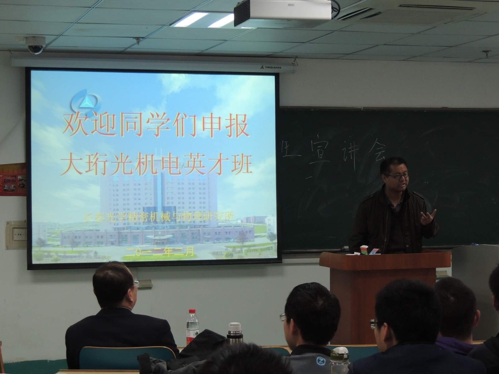 3月18日,长春光学精密机械与物理研究所张涛副所长与研究生部主任蒋大鹏一行来到我校进行王大珩光机电科技英才班招生宣传。蒋大鹏主任于3月18日下午在西区第三教学楼3214做了一场精彩的宣传报告,报告吸引了众多学生。宣讲报告由英才班项目助理凌强副教授主持。英才班项目主管刘发林教授和长光所的随行老师们也为学生们做了细致的咨询指导。