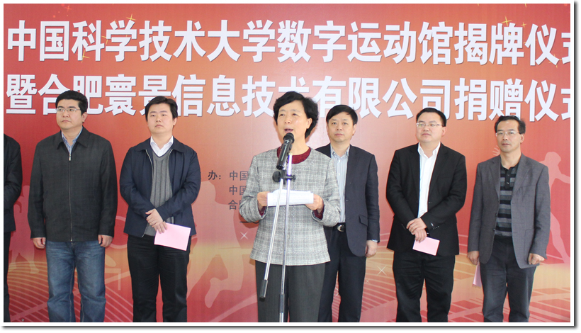 鹿明代表学校对各位领导和嘉宾的到来表示热烈欢迎,对合肥寰景信息技术有限公司对学校的大力支持表示衷心感谢。她说,科大建校55周年来,在人才培养和科学研究方面取得了举世瞩目的成果。近年来,学校积极改善办学条件、发展高新技术学科、申请国家重大科技专项,努力助推世界一流研究型大学建设。学校的快速发展,既是学校内部凝心聚力、开拓创新的结果,也离不开外部资源的大力支持。越来越多的校友主动支持母校教育事业发展,合肥寰景信息技术有限公司总裁陈拥权先生就是回馈母校的杰出代表。欢迎更多的校友和社会各界人士参与学校的发展建设、与中国科学技术大学共同进步和成长。