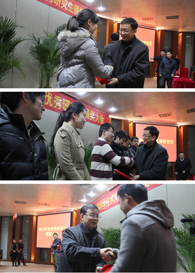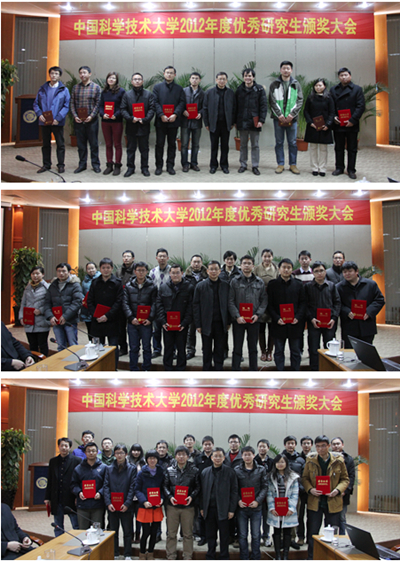 会上,研究生院副院长陈伟、古继宝首先宣读了有关表彰文件及获奖名单。2012年度,我校共有1名博士荣获“全国优秀博士学位论文奖”、14名博士荣获“全国优秀博士学位论文提名论文奖”、16名博士荣获“中国科学院优秀博士学位论文奖”、10名研究生荣获“中国科学院院长特别奖”、60名研究生荣获“中国科学院院长优秀奖”、312名研究生荣获“研究生国家奖学金”、25名博士荣获“国家级博士研究生学术新人奖”、34名博士荣获“校级博士研究生学术新人奖”。侯建国校长为获奖研究生颁奖,并合影留念。
