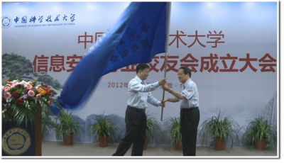 会上,陈晓剑代表校友总会宣布我校信息安全行业校友会正式成立并向大会选举产生的首任会长裴定一校友授予“中国科学技术大学信息安全行业校友会”会旗。