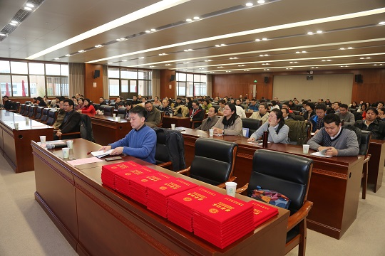 1月15日下午,学校在东区师生活动中心五楼报告厅召开2018年度学生工作总结会,校党委副书记蒋一、校学生工作指导委员会委员、各院系学生工作办公室主任、学生工作秘书、全体辅导员班主任和学生工作部(处)全体工作人员参加了会议。会议由学生工作处副处长聂磊主持。
