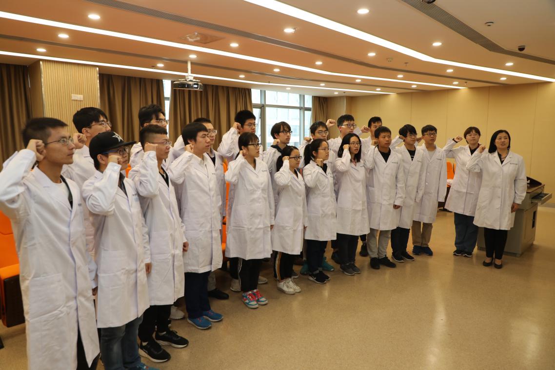 白衣授予仪式由许戈良院长、徐晓玲副院长、臧建业副院长共同作为师长代表为同学们赠予白衣。同学们依次来到主席台,由三位院领导为他们穿上象征着职业圣洁与荣耀的白衣,并一一合影留念。最后,徐晓玲副院长带领同学们进行了宣誓仪式。英才班同学身穿崭新的白衣,在领誓人的宣读下,对自己以后的医学之路进行了宣誓。“我志愿献身医学,热爱祖国,忠于人民,恪守医德,尊师守纪,刻苦钻研,孜孜不倦,精益求精,全面发展。我决心竭尽全力除人类之病痛,助健康之完美……”。在师生们的共同见证下庄严宣誓医学职业精神誓言,让每一个学生能够从进入医学殿堂的那一刻起就牢记自己肩负的责任和使命,并在将来的学习和工作中始终保持应有的职业精神和素养。宣誓仪式结束后,院领导和同学们一起合影留念,记录下这一庄严时刻。