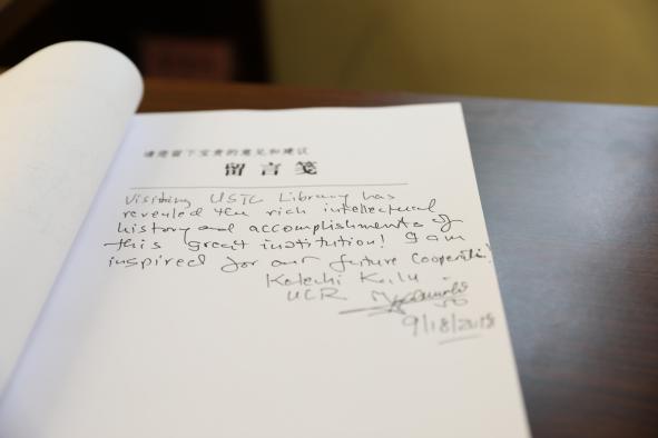 会后,为更好地了解中国科大60年来的发展史,代表团一行参观了校史馆。来宾们对我校在人才培养、科学研究方面取得的突破性成果表示赞叹。Kelechi Kalu在签到处认真写下了参观体会。