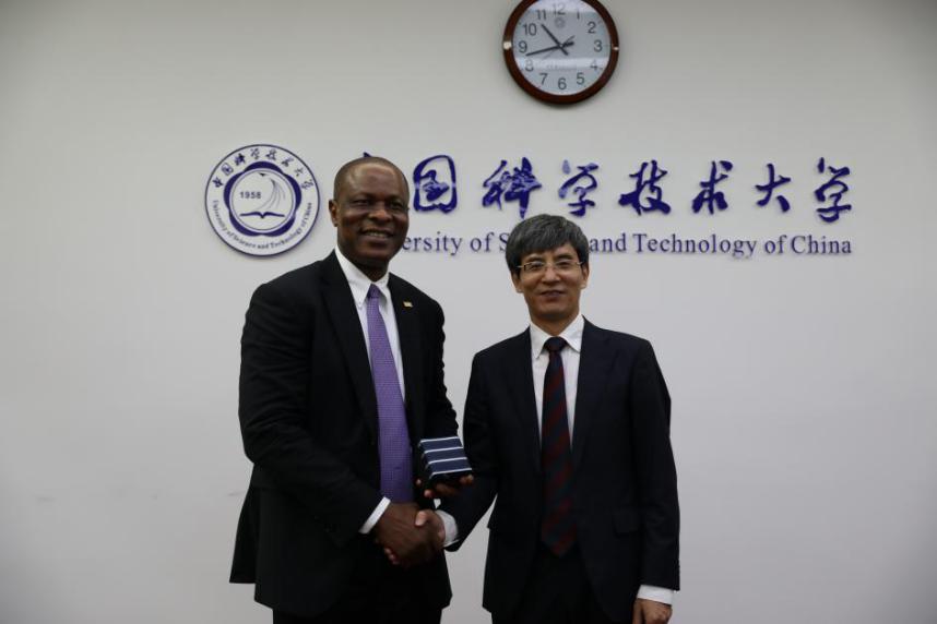 Kelechi Kalu首先对中国科大60周年校庆表示祝贺,高度肯定了中国科大六十年来取得的丰硕成果。他回顾了河滨分校与中国科大合作的总体情况,并就如何继续推进两校“3+1”本科生交流项目进行了探讨。他表示,非常希望与我校在师生交流、科研合作等方面开展深入合作。