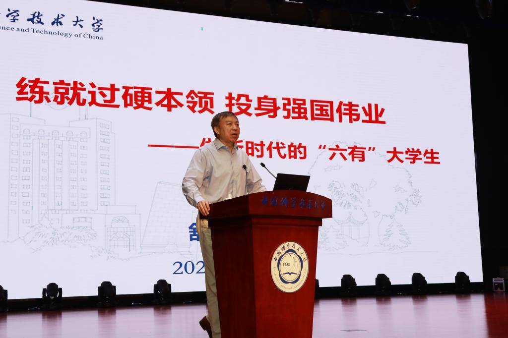 他为同学们讲述了老一辈科学家郭永怀、钱临照及新时代楷模钟扬的感人事迹,鼓励大家“要从老一辈科大人身上学习科大精神,不断汲取前进的力量。”