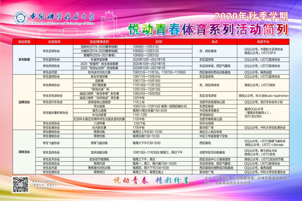 为贯彻落实习近平总书记关于教育、体育的重要论述,进一步繁荣校园体育文化生活,中国科学技术大学2020年悦动青春体育系列活动陆续开启。活动包括足球、篮球、排球、羽毛球、夜跑、龙舟、战术和武术等共计28项系列赛事或周常训练。活动由科大书院、校学生社团管指委、校青年体育拓展中心主办,17个体育运动类学生社团承办。