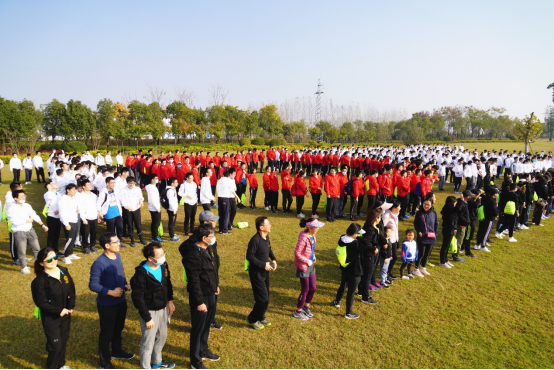 上午9点,参加活动的全体师生抵达肥西官亭林海。同学们身着红、白两色服装,老师们身着黑色服装,在起跑点外的草坪上摆出I Love USTC形状,大声喊出校训:“红专并进,理实交融!”现场气氛热烈,同学们热情满满。随后,全体师生在起跑点集合,在健身教练的带领下进行热身运动,为即将开始的11公里长跑做好充分准备。