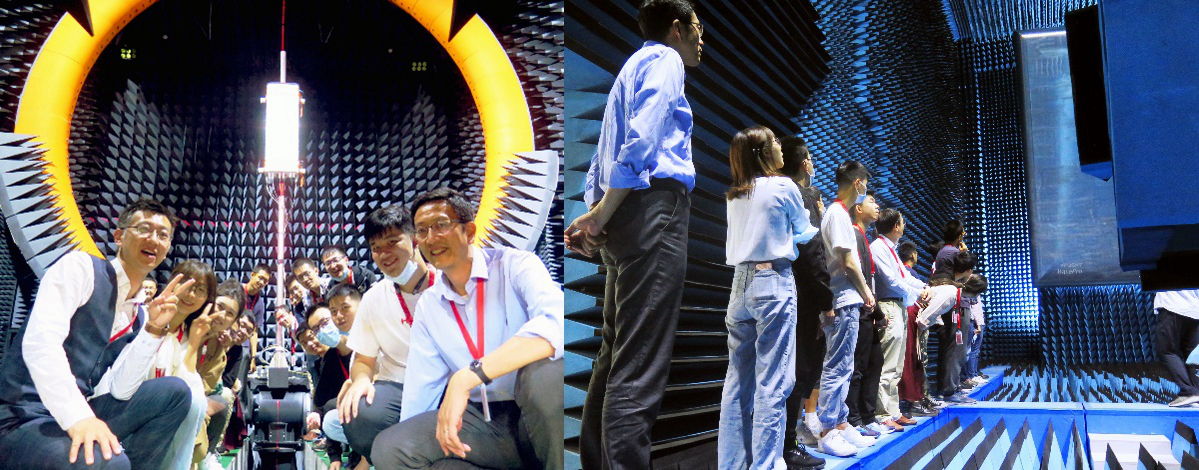 第二站是华为的麦克斯韦实验室,这里有着业界最大的天线试验场。在这里华为生产的每一根天线都会经受包括震动测试,压力测试,温度测试等各种人工模拟的极端自然环境的考验。在这里同学们还见到了让他们印象深刻的球面近场测试系统——StarGate。电影《星际之门》中那个巨大的圆环可以联通形成虫洞进行超长距离的空间旅行;而在这个巨大的微波暗室中,一个巨大圆环悬在半空,上面均匀分布着高精度的宽带接受振子,用于测试基站天线的各项性能。这套装置叫做StarGate真是极美也极合适,营造出一种静谧而科幻的独特美感,仿佛身处浩渺幽蓝的宇宙。