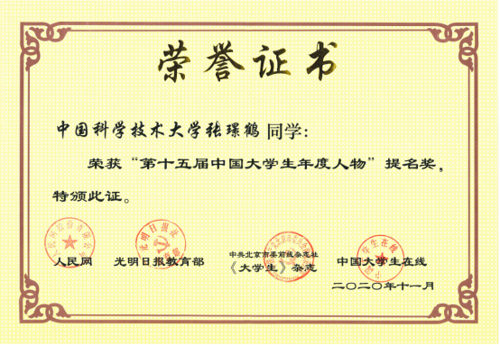 我校生命科学与医学部张璟鹤同学荣获“第十五届中国大学生年度人物”提名奖