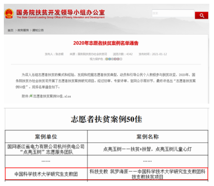 1月12日,国务院扶贫办社会扶贫司发布2020年志愿者扶贫案例名单通告,公布了“志愿者扶贫案例50佳”名单。我校“科技支教 筑梦海原——中国科学技术大学研究生支教团科技支教扶贫”项目成功入选。